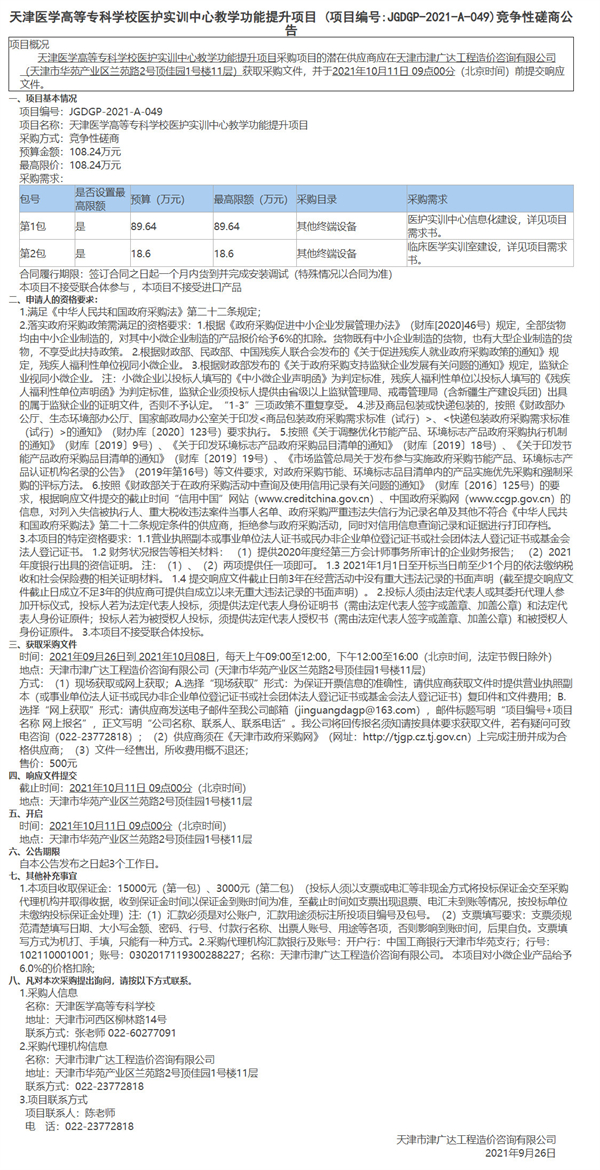 天津醫(yī)學(xué)高等??茖W(xué)校醫(yī)護(hù)實(shí)訓(xùn)中心教學(xué)功能提升項(xiàng)目